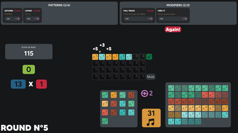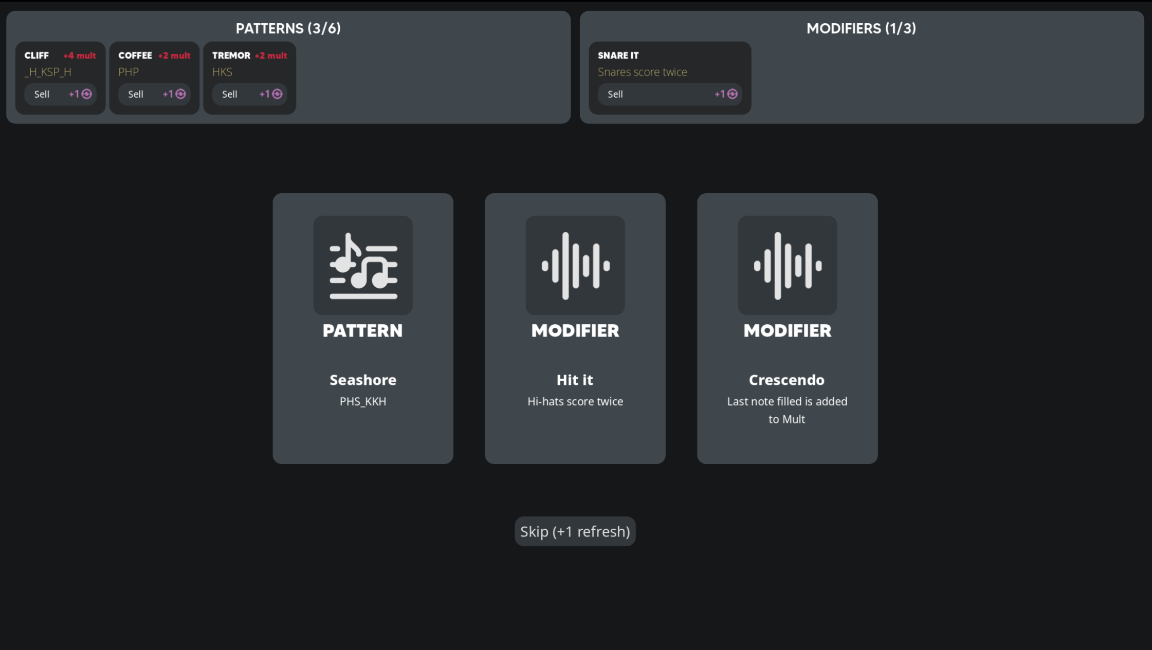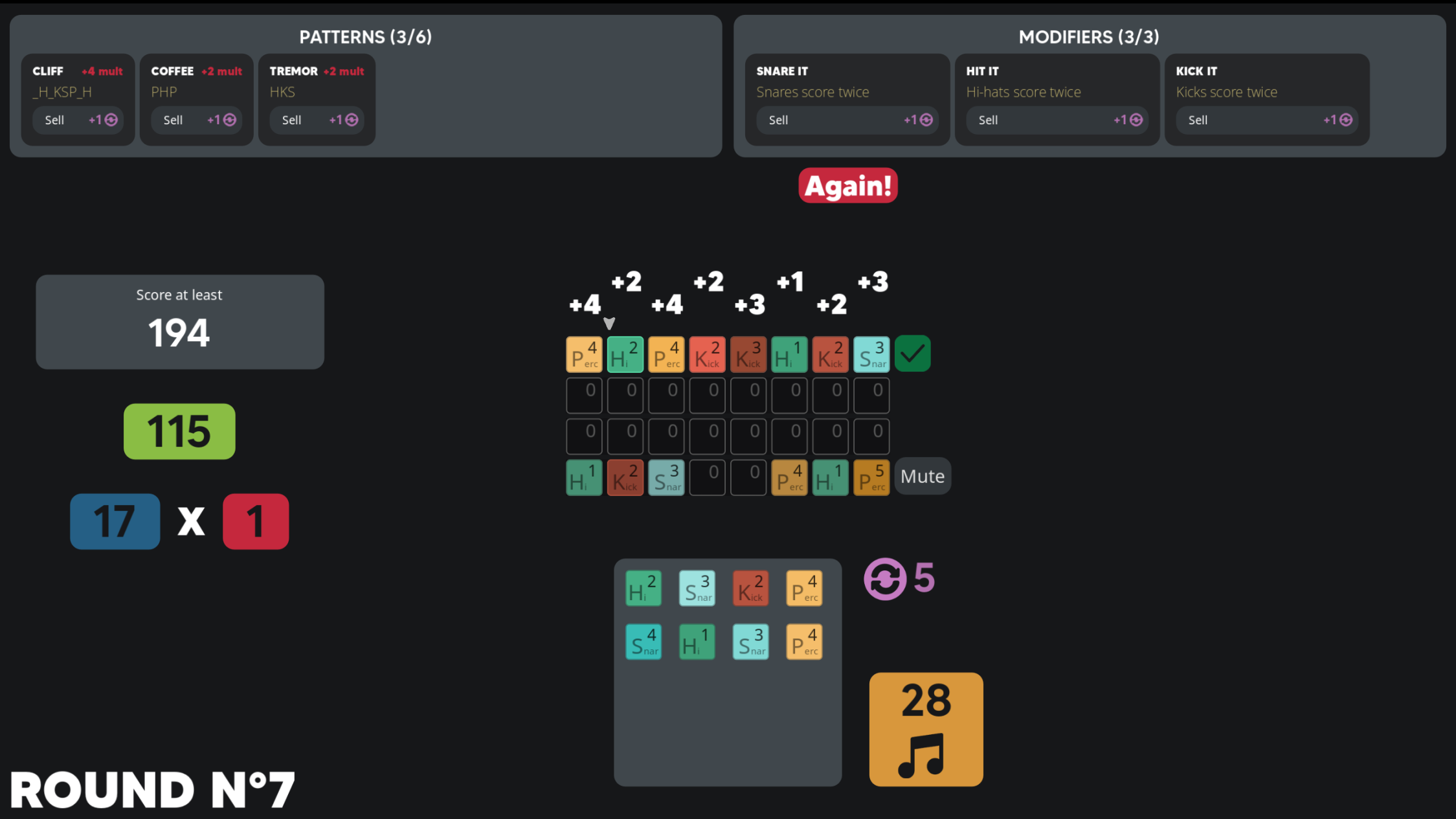 Use beats to create a drum loop out of 4 layers. Each time you submit a layer it scores, based on the beats, the patterns you made, and the modifiers you got.